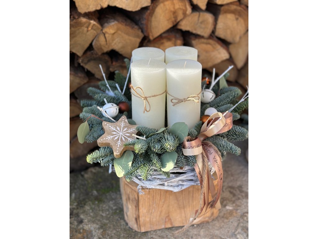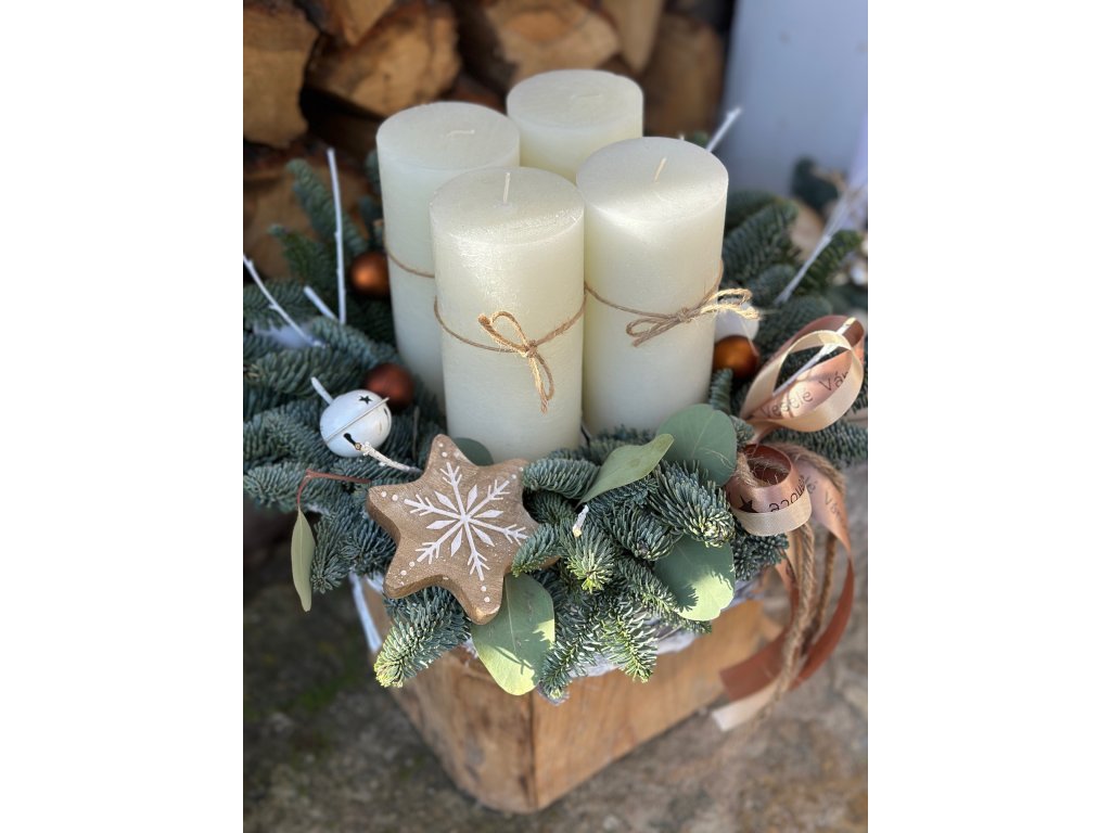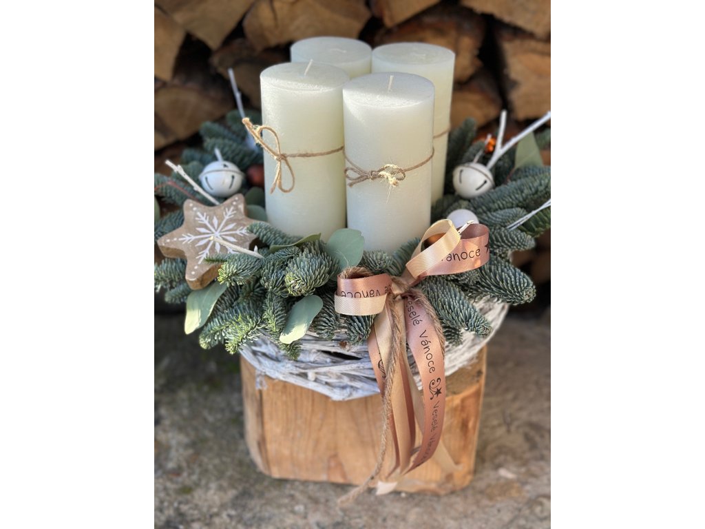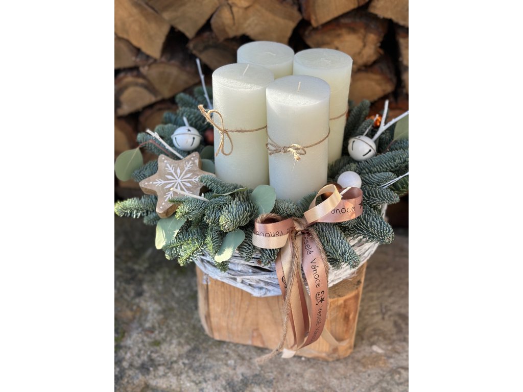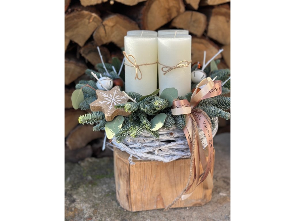 Tento adventní věnec jsem vytvořila pro všechny milovníky rustikálního stylu . Základ věnce tvoří krásné proutěné hnízdo, dozdoben je jedličkou NOBILIS, eukalyptem, rustikálními přízdobami a čtyřmi válcovými svíčkami v okouzlujícím odstínu CHAMPAGNE. Průměr věnce je 36 cm a výška cca 30 cm.