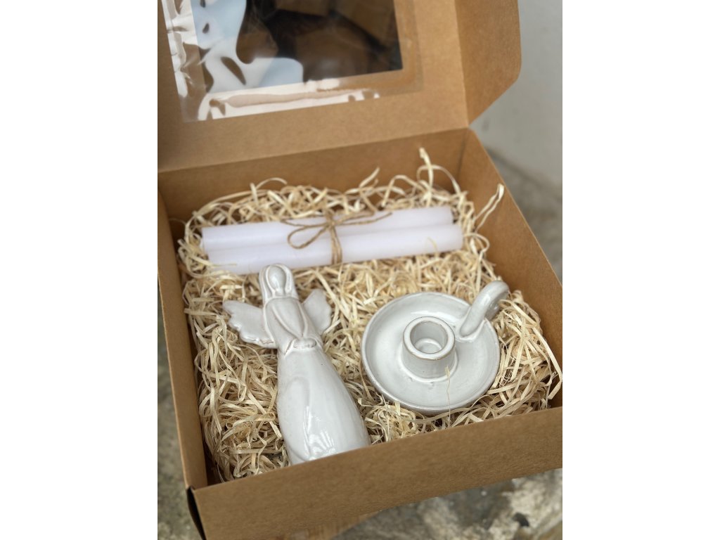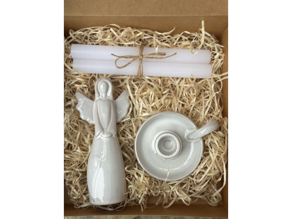 Krásná dárková sada, která zahřeje u srdce každého. Skládá se ze svícnu na kónickou svíčku a okouzlujícího keramického anděla. Obojí ve stejné glazuře. Součástí jsou 2 ks svíček a dárková krabice s dřevitou vlnou. Rozměry krabice: 26 cm x 26 cm x 10 cm.