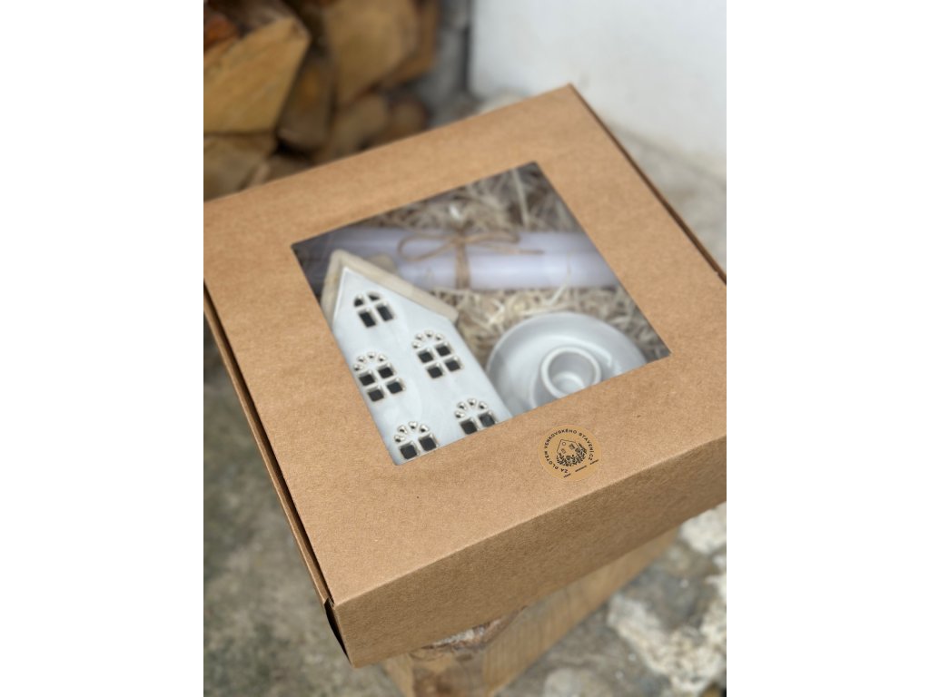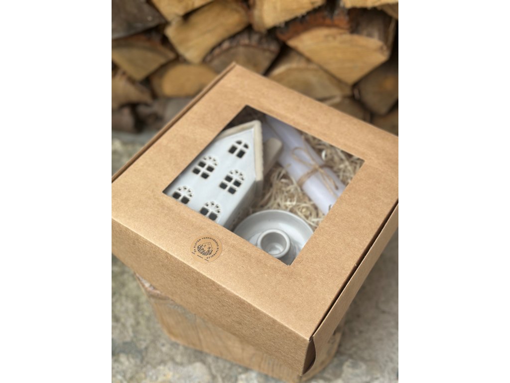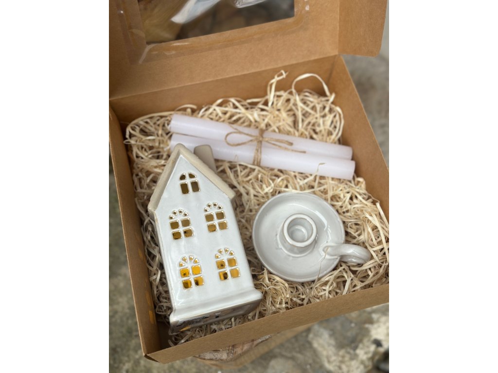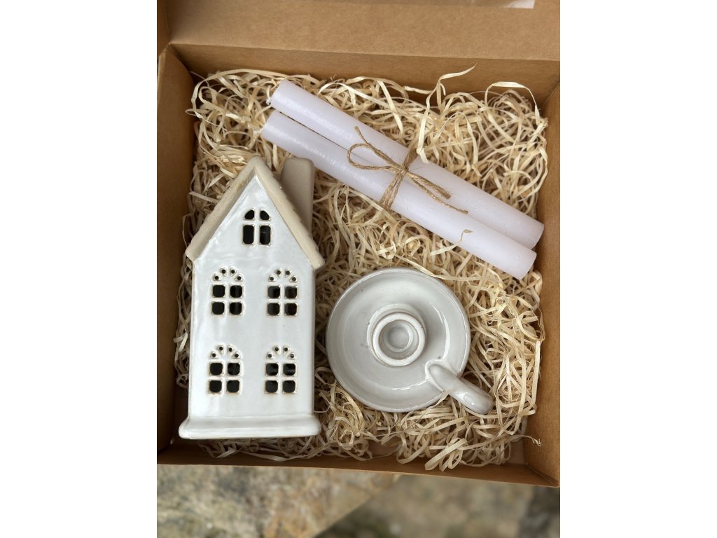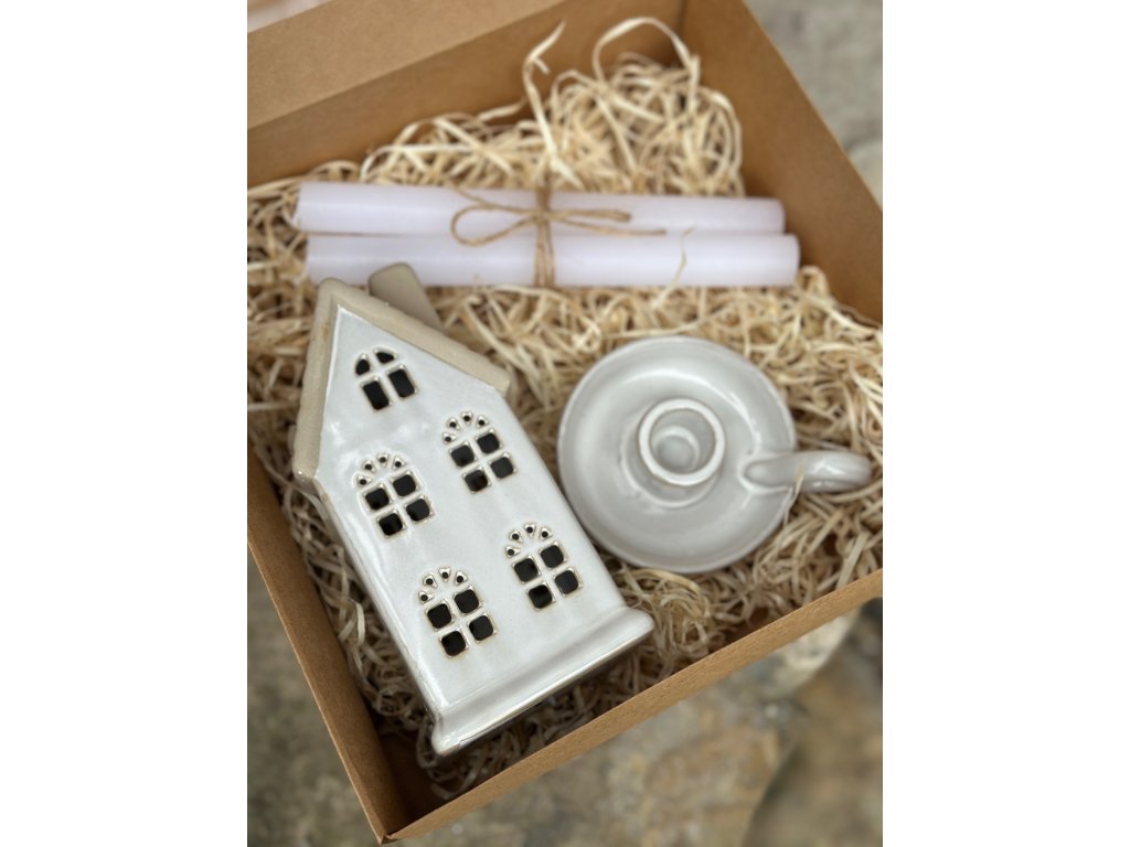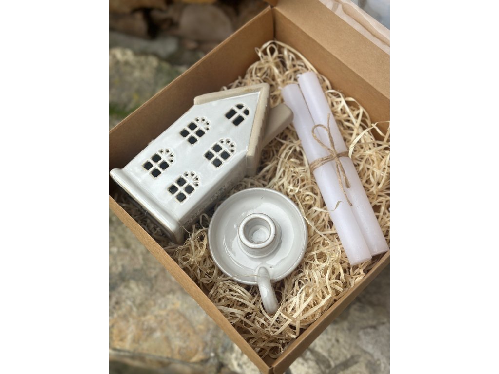 Krásná dárková sada, která zahřeje u srdce každého. Skládá se ze svícnu na kónickou svíčku a okouzlujícího keramického domečku na led světýlko. Obojí ve stejné glazuře. Součástí jsou 2 ks svíček a dárková krabice s dřevitou vlnou. Rozměry krabice: 26 cm x 26 cm x 10 cm.