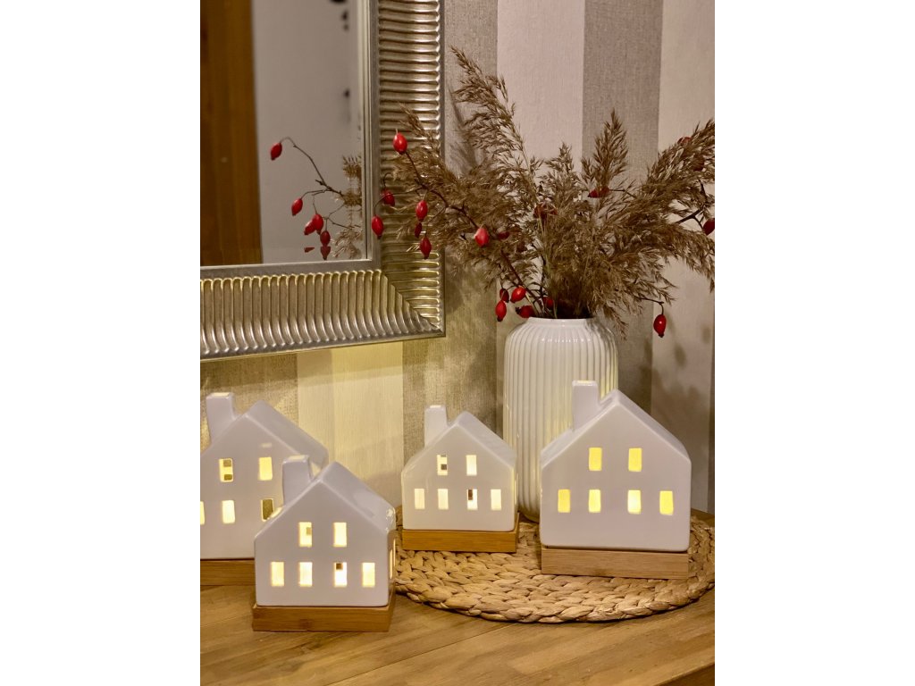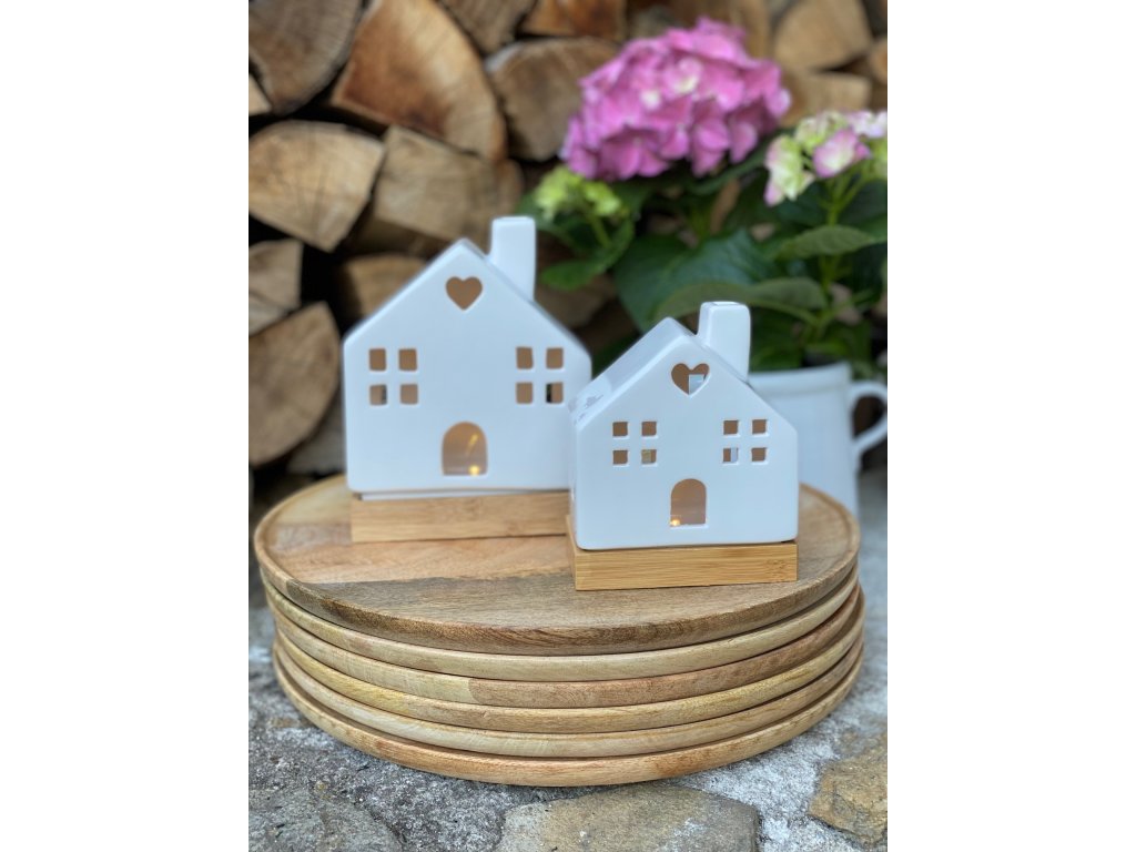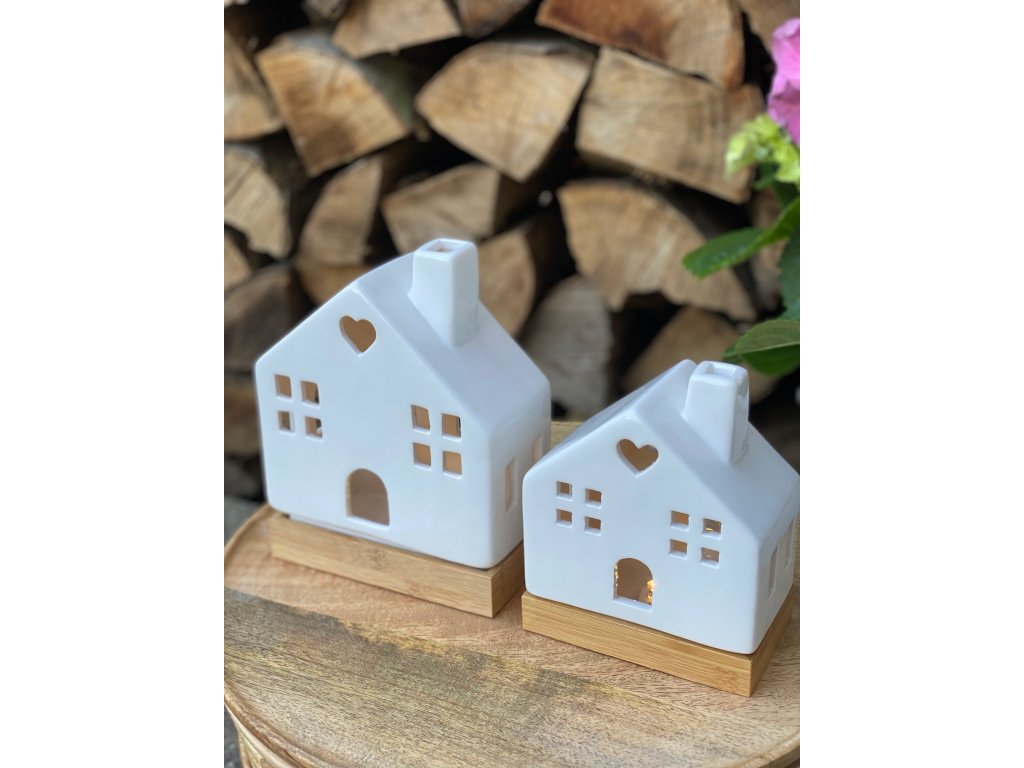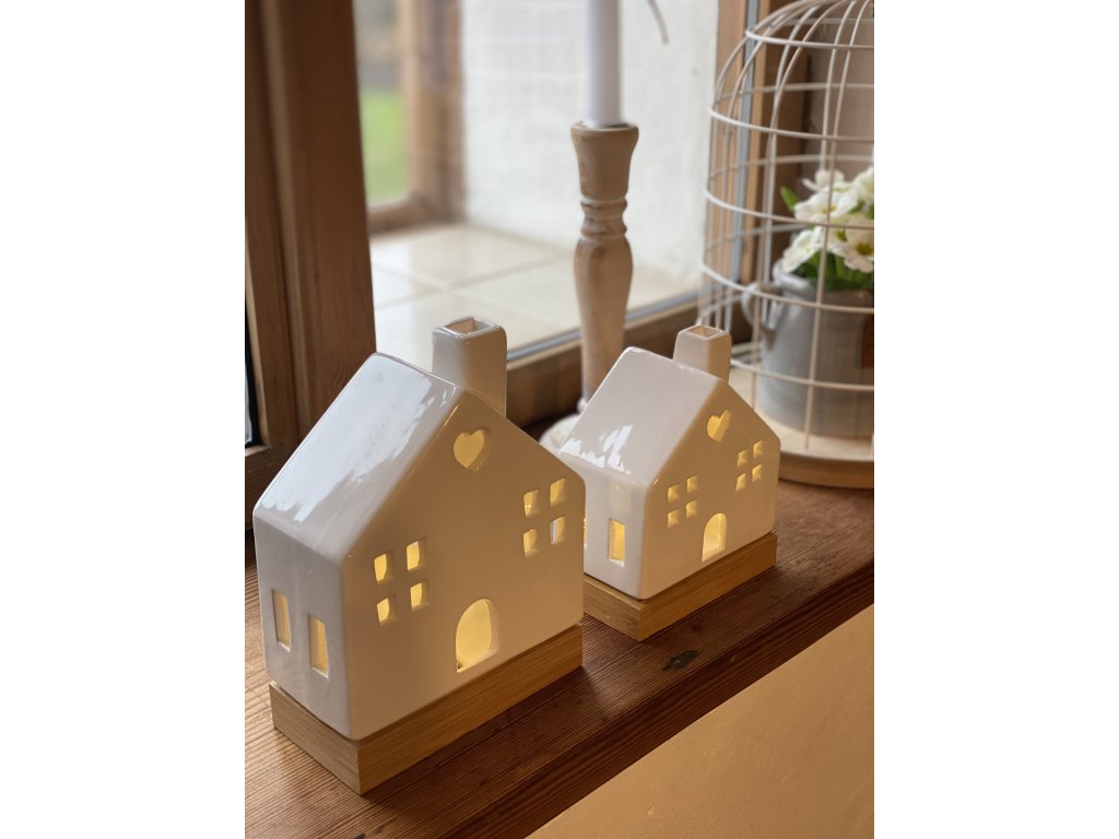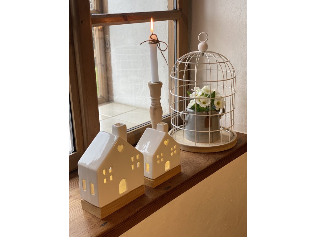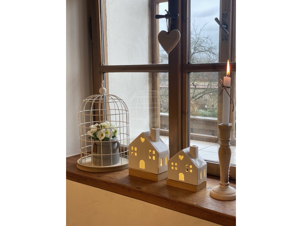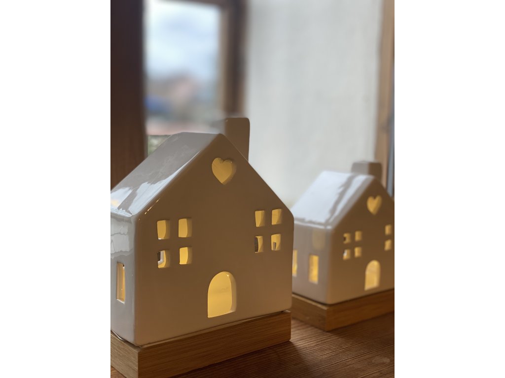 Keramické domečky na dřevěném podstavci jsou krásnou stylovou dekorací. Díky LED světýlku je snadno rozsvítíte a jsou oboustranné (nepotřebují otvor na svíčku). Z jedné strany jsou se srdíčkem, z druhé mají rovná okénka. Prodávají se ve dvou velikostech, velmi pěkné jsou vedle sebe menší a větší velikost.rozměr menšího:.11cm x 6,5cm x 13,5cmrozměr většího: 13cm x 6,5cm x 17,5cm