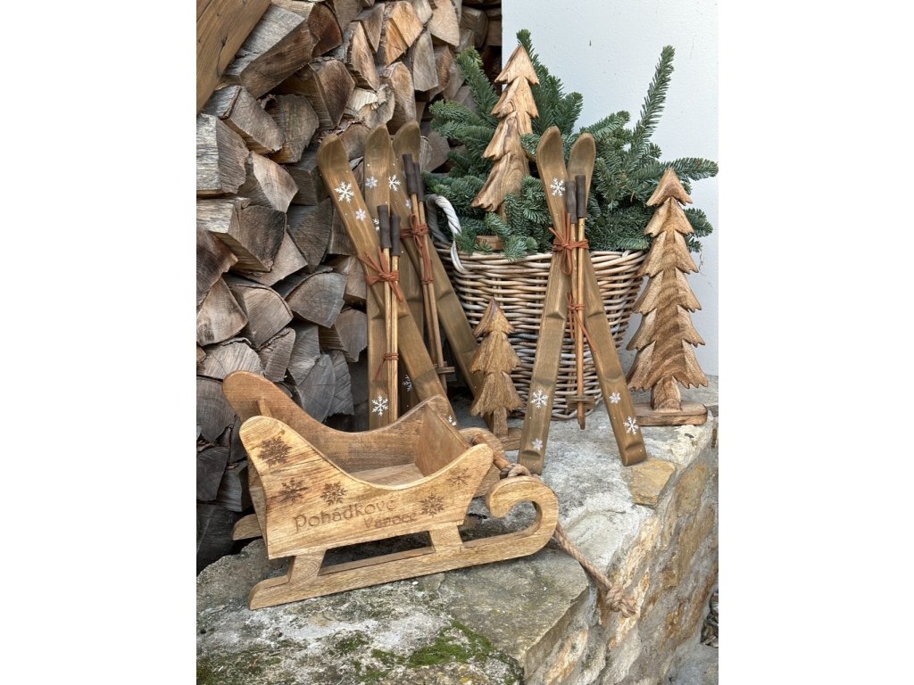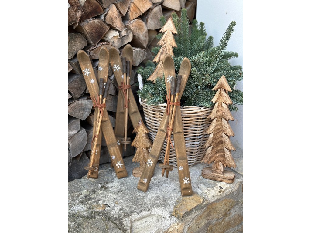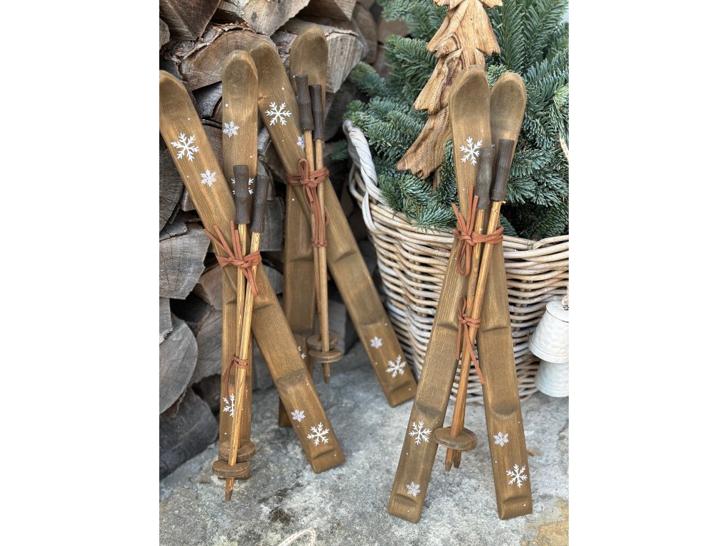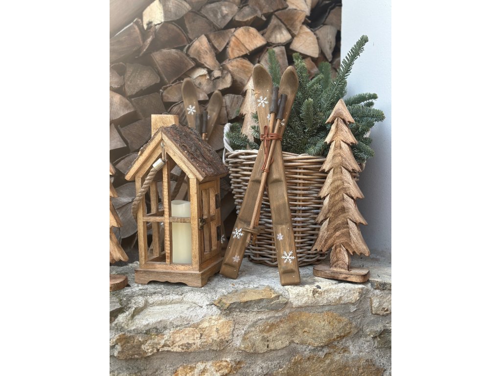 Nádherné dřevěné lyže dodají zimní atmosféru každému vstupu do domu. Krásné budou i v interiéru, např. na stěně nebo opřené o stěnu u vánočního aranžmá. Jsou vysoké 51,5 cm a jsou v sadě s hůlkami. Krásně jim to ladí s dekoracemi z mangového dřeva, např. s lucernami, chaloupkou, stromečky.