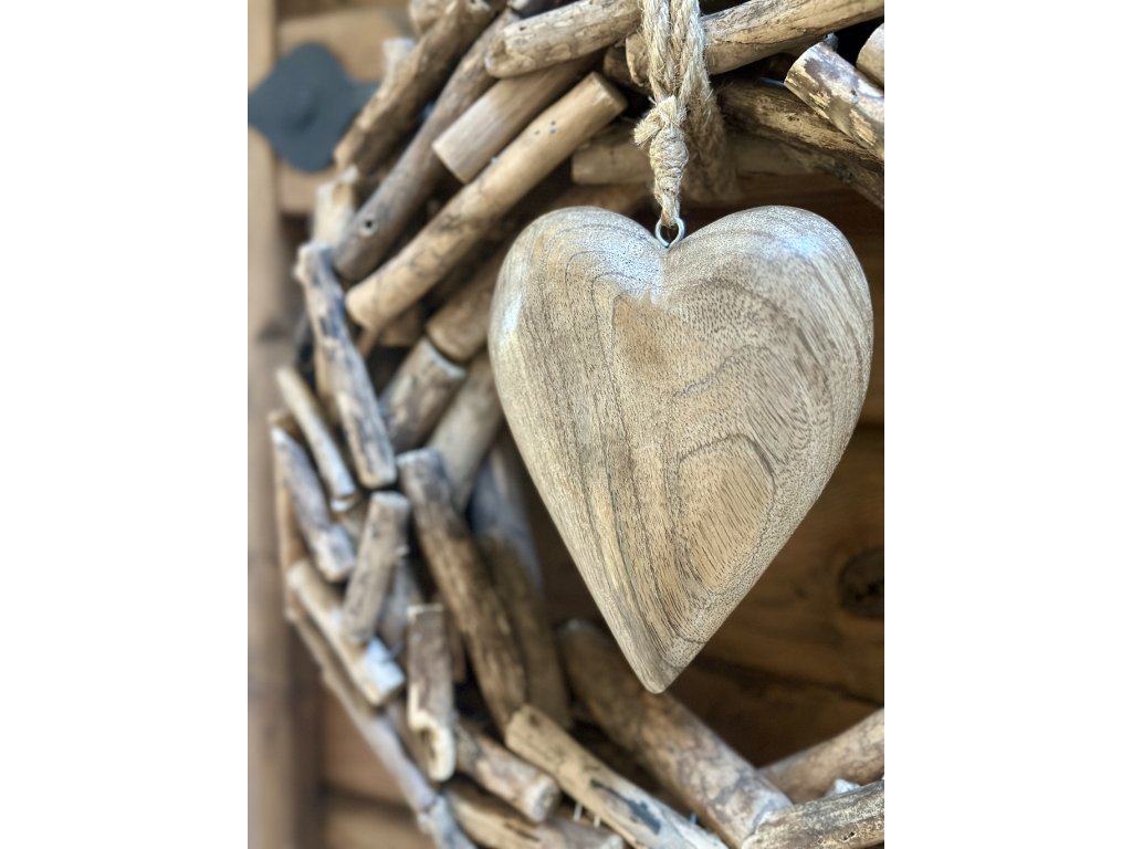 Tento dřívkový věnec s velkým srdcem z mangového dřeva zútulní každý interiér i exteriér. Skvěle se hodí např. nad komody, na chodby, schodiště, ale také pro zútulnění pergol a venkovních teras. Krásný bude samozřejmě i na dveřích. Průměr má 40 cm. Každý kus je originál.