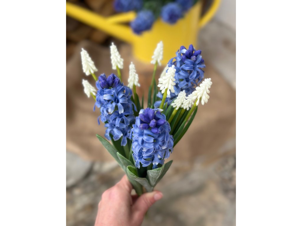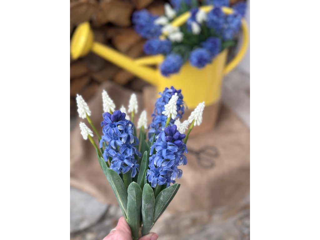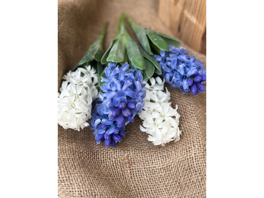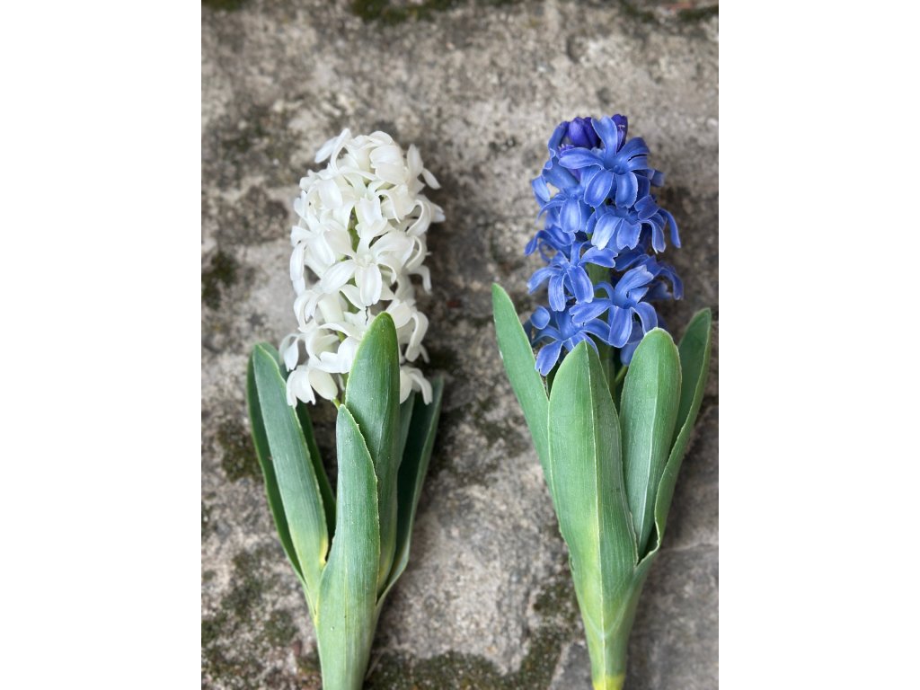 Dokonalé zpracování těchto hyacintů je činí k nerozeznání od pravých. V nabídce je mám v bílé nebo tradiční modré (lehce do fialova). Krásná je i jejich kombinace. Hodí se do vázy, do truhlíků....Délka stonků je 27 cm.