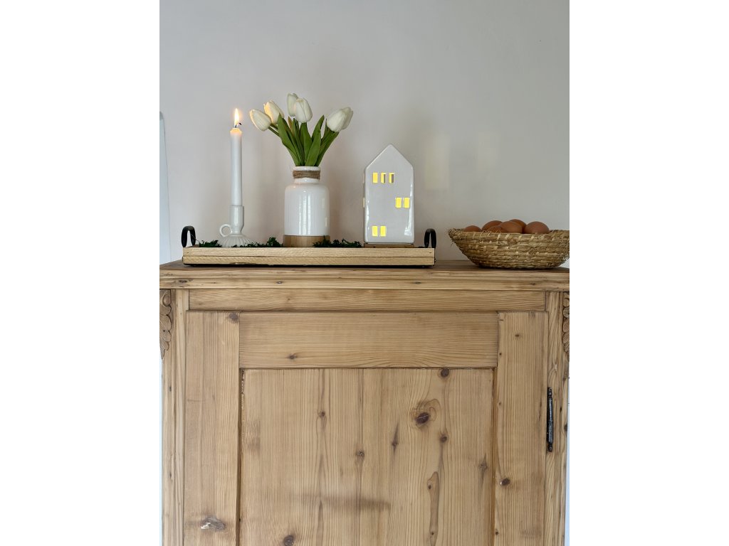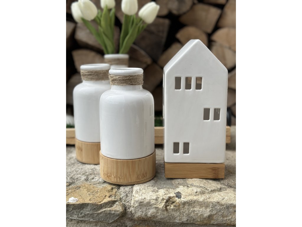 Tato keramická váza na dřevěném podstavci má naprosto ideální velikost k umístění na jídelní stůl nebo růžné skříňky, komody a okenní parapety např. společně s dalšími dekoracemi. Průměr dna je 9,5 cm, tudíž se vejde i na obdelníkové a kulaté podnosy. Ve stejném dekoru dřeva se k ní hodí i velké keramické led domečky. Výška vázy je 18 cm.