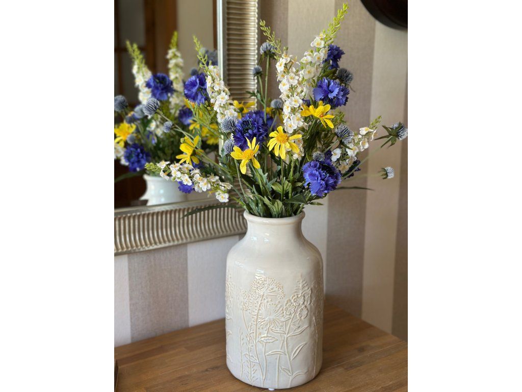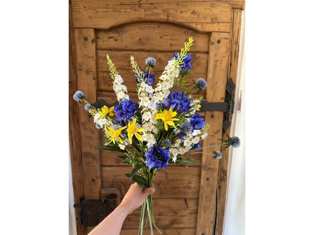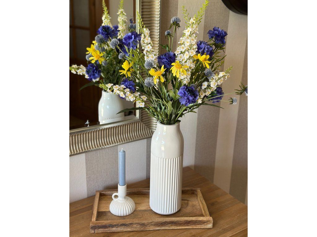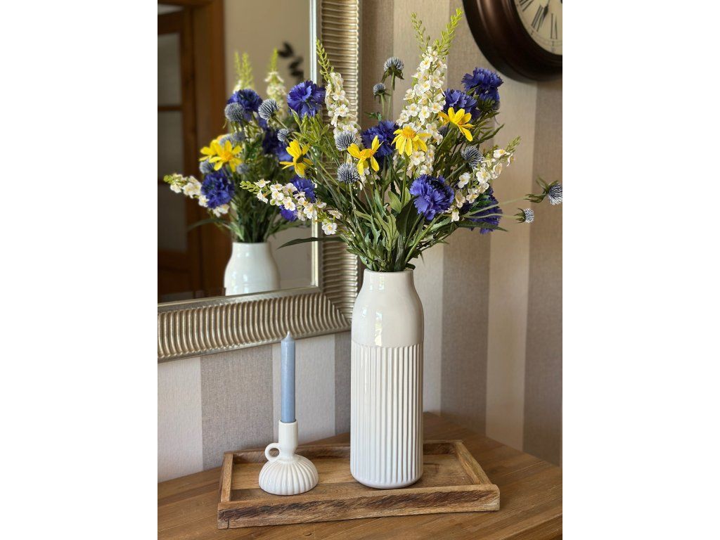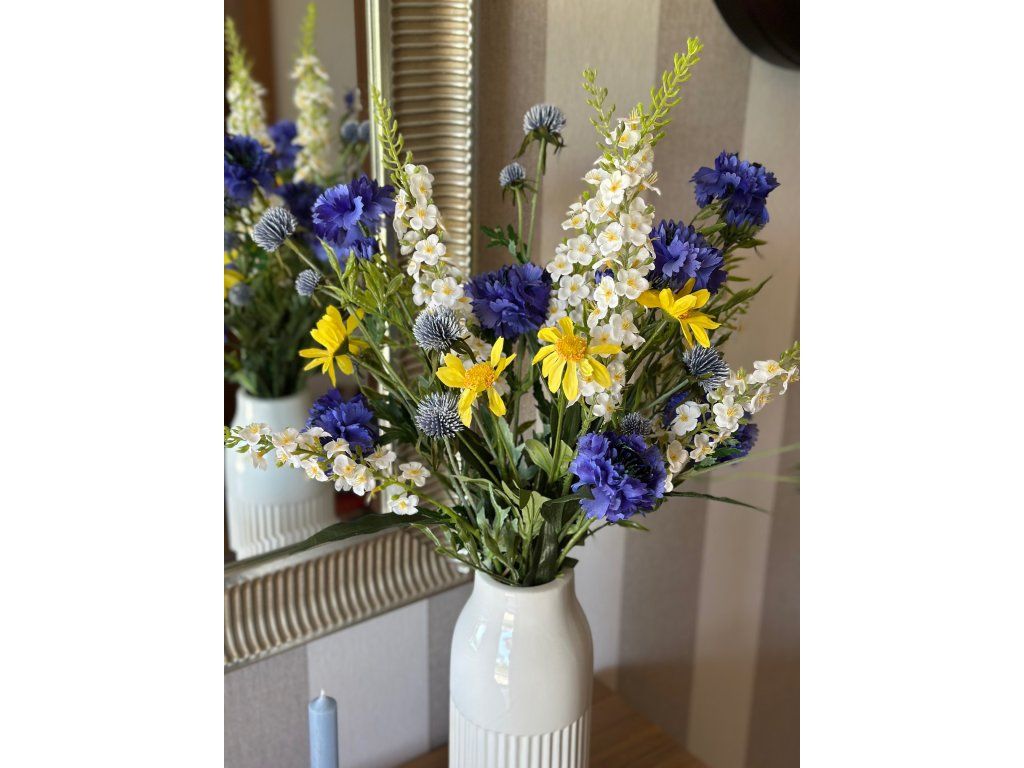 Krásná rozevlátá luční kytice z umělých květin, které jsem kombinovala tak, aby působily co nejvíce přirozeně. Délka kytice je 70 cm, lze libovolně zkrátit tak, aby se vešla i do průměrné velikosti džbánu nebo vázy. Do souvisejících produktů vkládám 2 vázy z mé nabídky, které se k ní hodí (vždy ta větší velikost). Kytice obsahuje 10 květin: 3x chrpu, 3x delphinium, 2 větvičky nádherných bodláčků, 2 stonky žlutých kopretin.