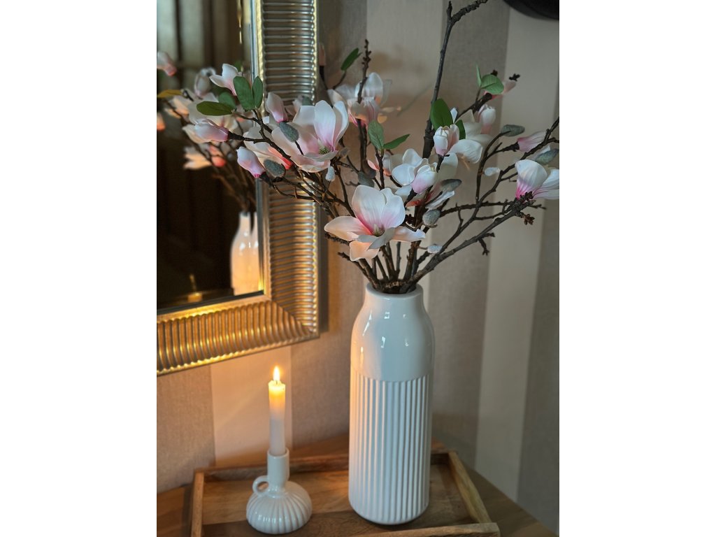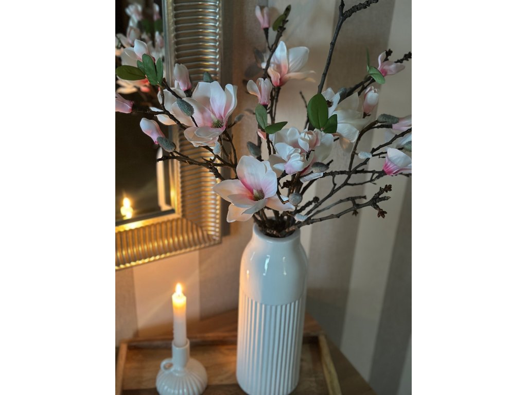 Krásná magnolie s velkým květem a poupaty na věrohodné větvičce vnese brzké jaro do každého domova. Stačí k ní přidat pár přírodních větviček a máte dokonalé květinové aranžmá pro pozdní zimu a brzké jaro. Délka větvičky je 50 cm. Na fotce ve váze je 6 ks větviček. Použila jsem vyšší bílou vázu s vroubky.