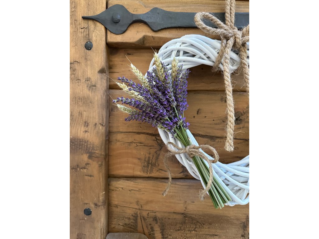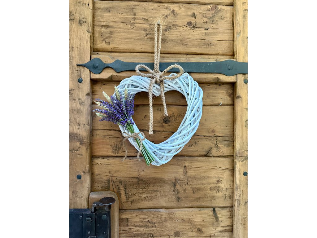Bílé proutěné srdce s přírodním provazem a levandulí zútulní a provoní každý kout domova. Sluší mu to snad úplně všude - na dveřích, vrátkách, v interiéru na stěně nebo např. na pergole. Velikost: 30 x 30 cm .