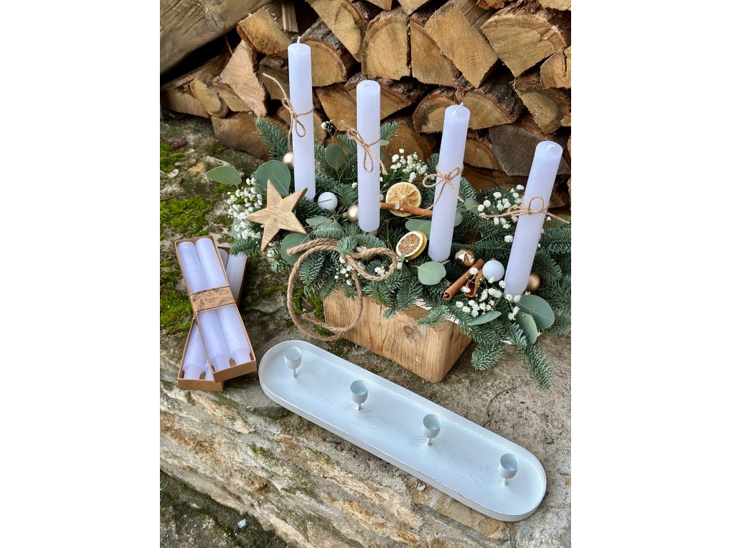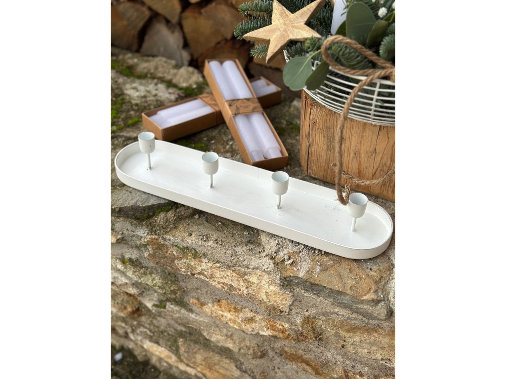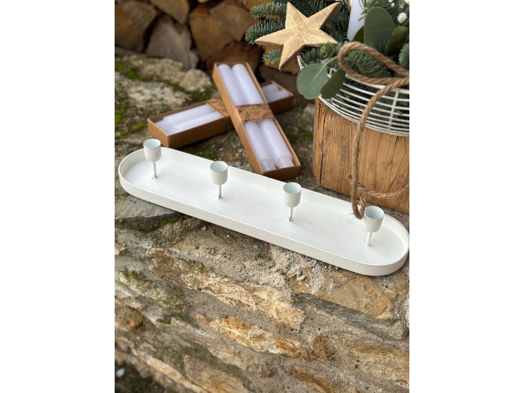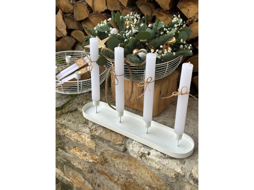 Rustikální kovový svícen je opatřen 4 stojánky na kónické svíčky, tyto svíčky jsou v ceně svícnu. Svíčky mají průměr téměř 3 cm a vysoké jsou 25 cm. Tedy větší než běžné kónické svíčky. Svícen si můžete dozdobit dle vlastní představy nebo dle inspirace na mém profilu na Instagramu. Délka svícnu je 44 cm.