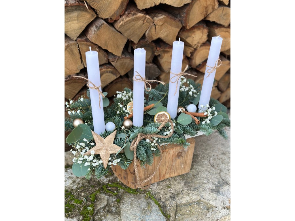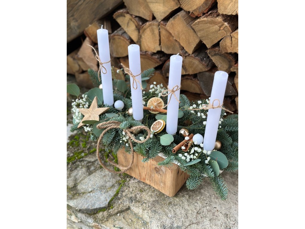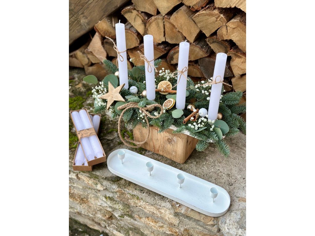 Postup: mezi stojánky na svíčky umístěte nařezanou aranžovací hmotu, postupně do ní zapichujte větvičky chvojí (nejlépe jedle nobilis - zakoupíte v každém zahradnictví), do stojánku umístěte kónické svíčky (pro lepší fixaci je můžete upevnit tavnou pistolí ). Svícen můžete dozdobit dle Vaší představy.