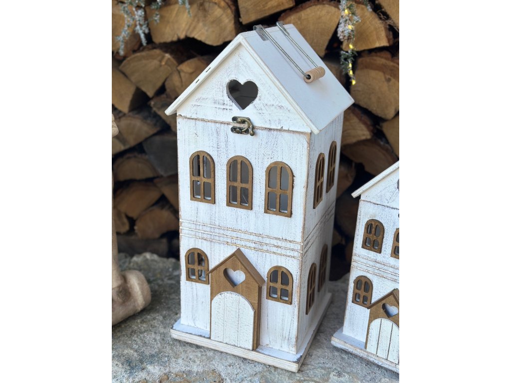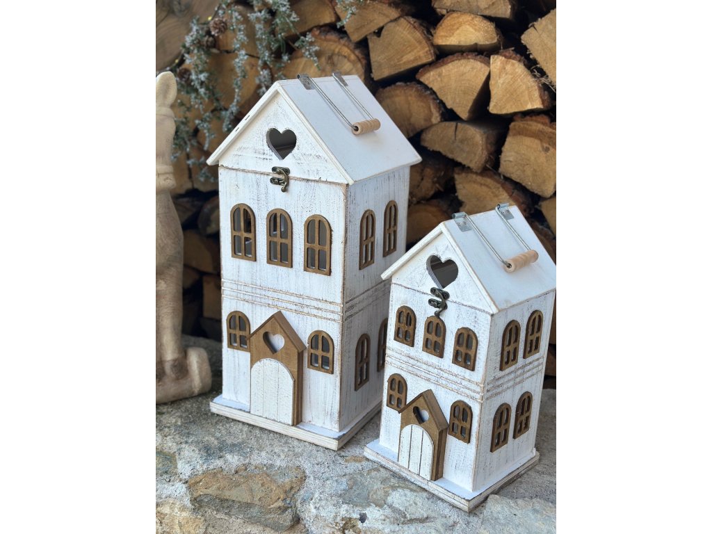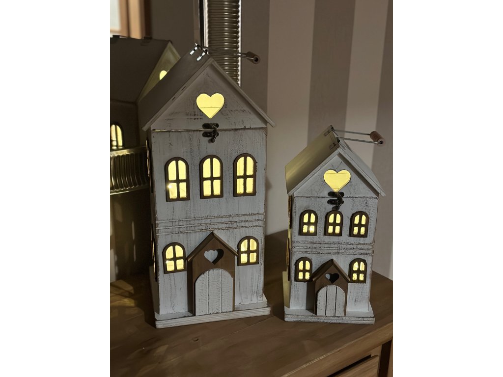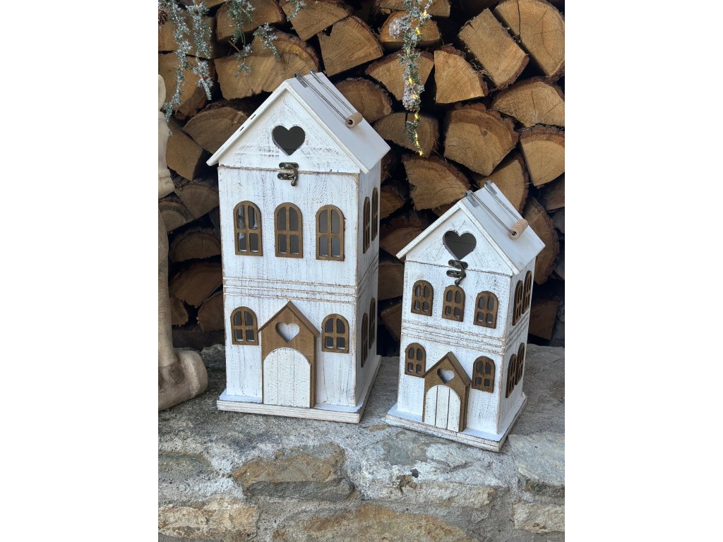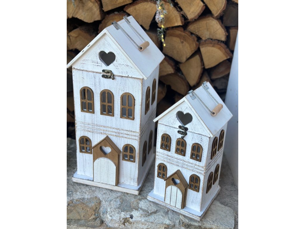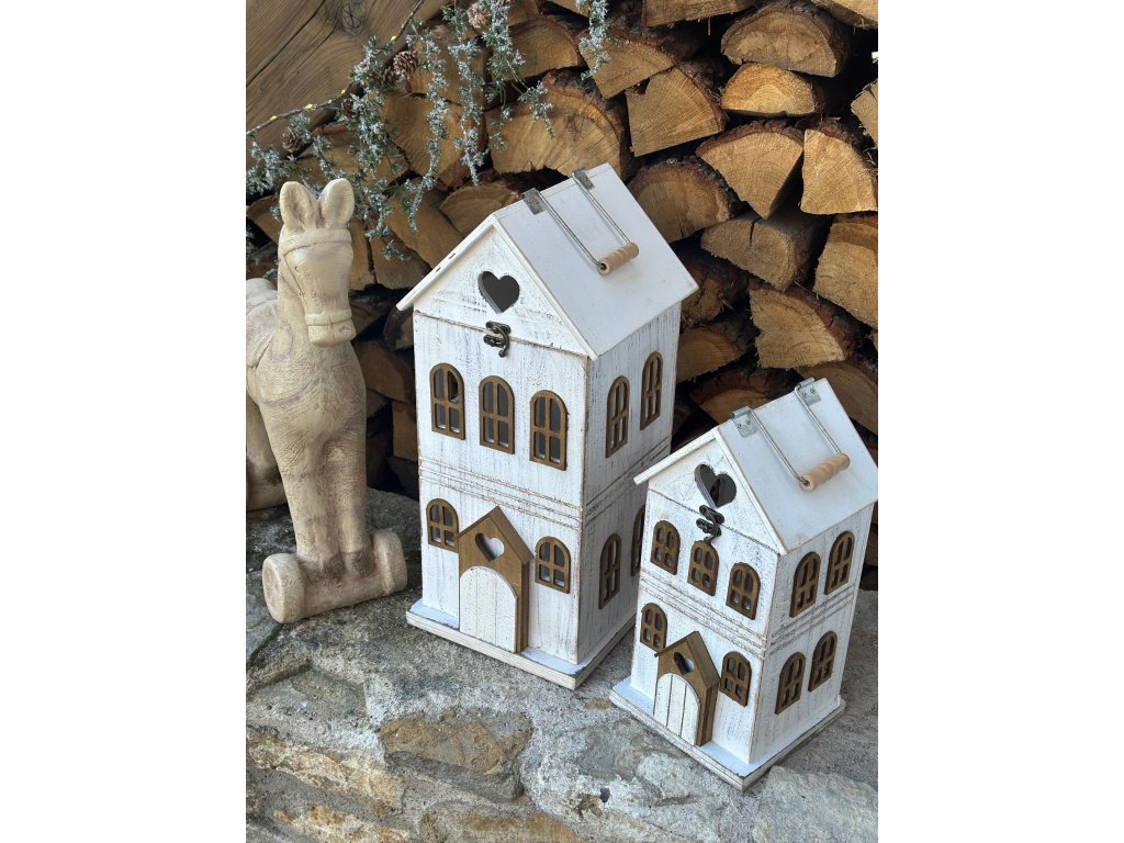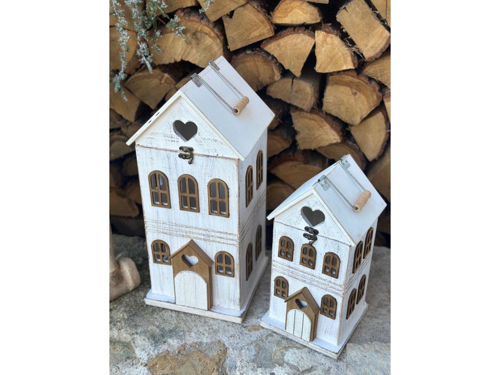 Okouzlující celoroční domečkové lucerny vnesou útulnou atmosféru do každého domova. Mohou být umístěny v interiéru nebo krytém exteriéru (mimo déšť). Aby vydržely co nejdéle tak doporučuji venku nechávat jen po určitou dobu, např. na sezónu Vánoc. Lucerny jsou opatřeny led světýlky uvnitř luceren, tudíž budou krásné i v podzimním a zimním období. Sada obsahuje 1 ks malé a 1 ks velké lucerny. Rozměry: Malá 34 cm x 17 cm a velká: 48 cm x 22 cm.