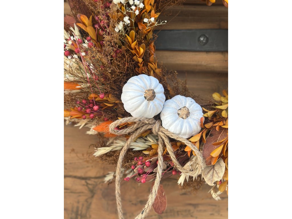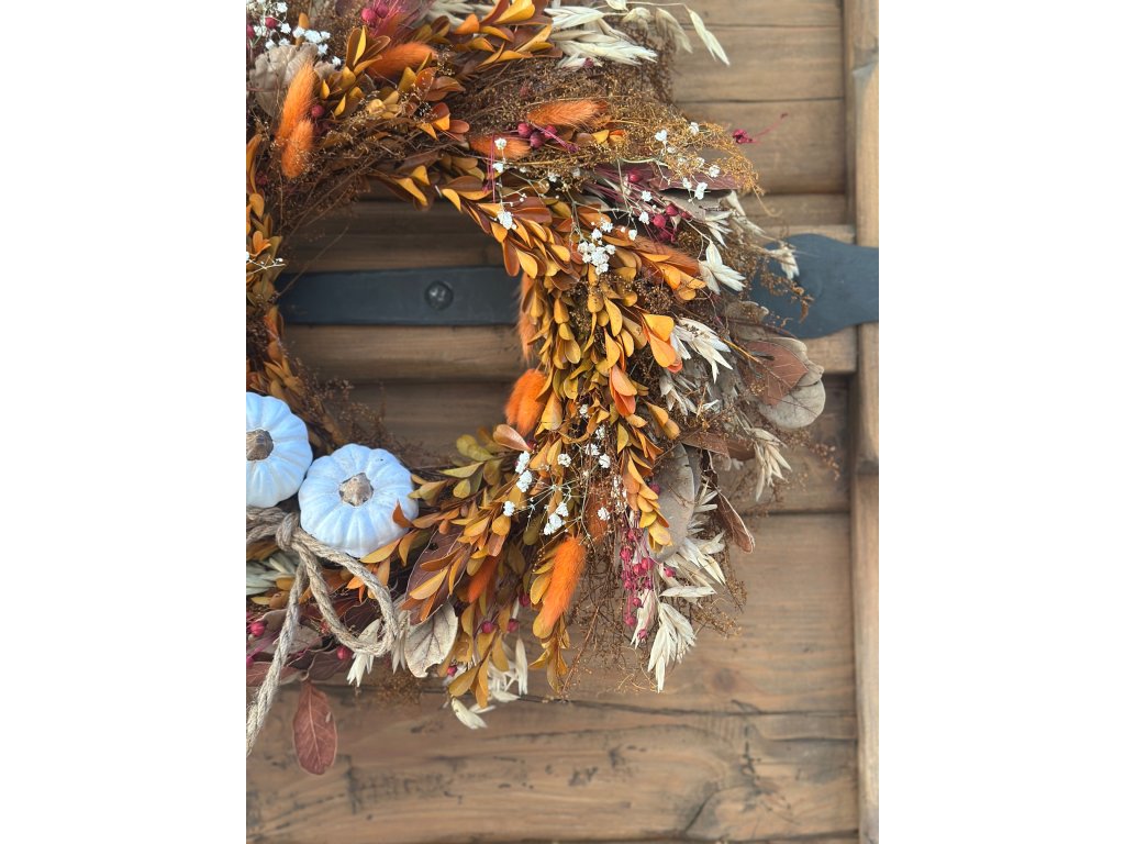 Krásný věnec ze sušeného a stabilizovaného materiálu dozdobený dýněmi z keramiky a přírodní mašlí. Je vhodný do interiéru nebo na stanoviště krytá před deštěm. Věnec je velmi lehký a je proto vhodný i např. na skleněné dveře. Průměr věnce je 40 cm.