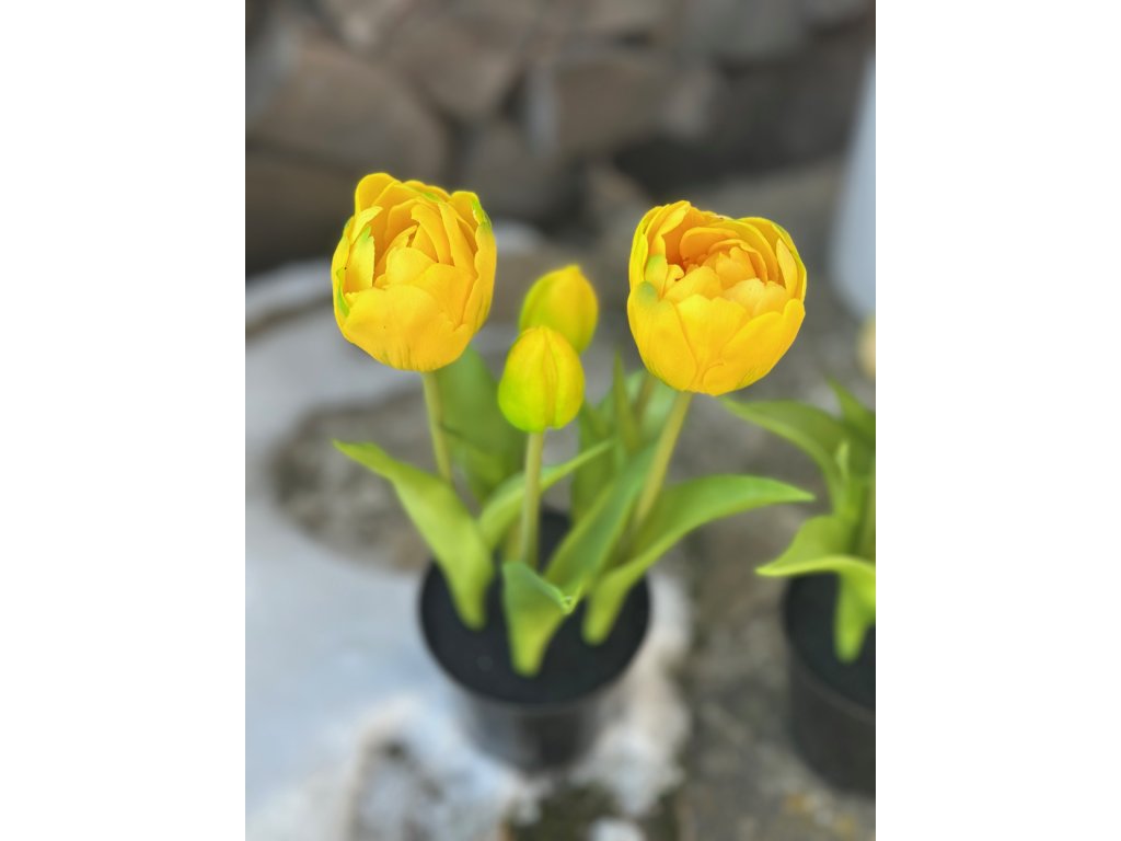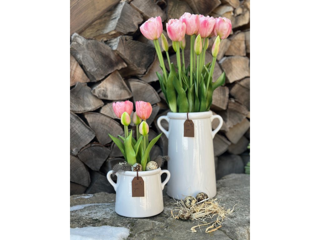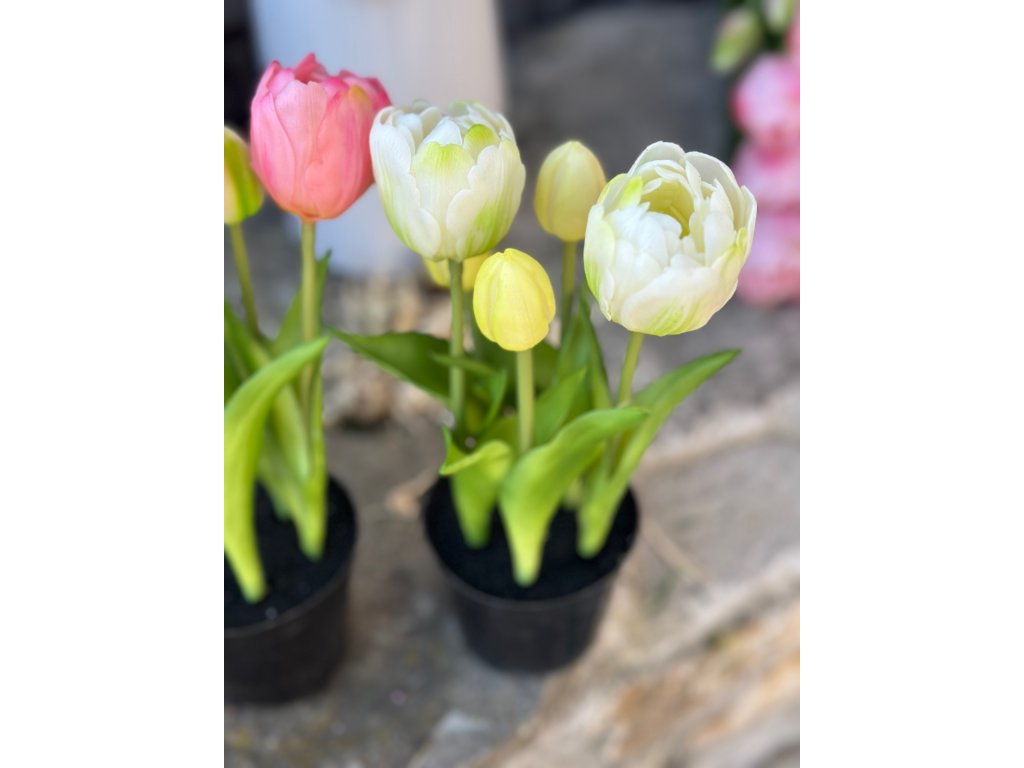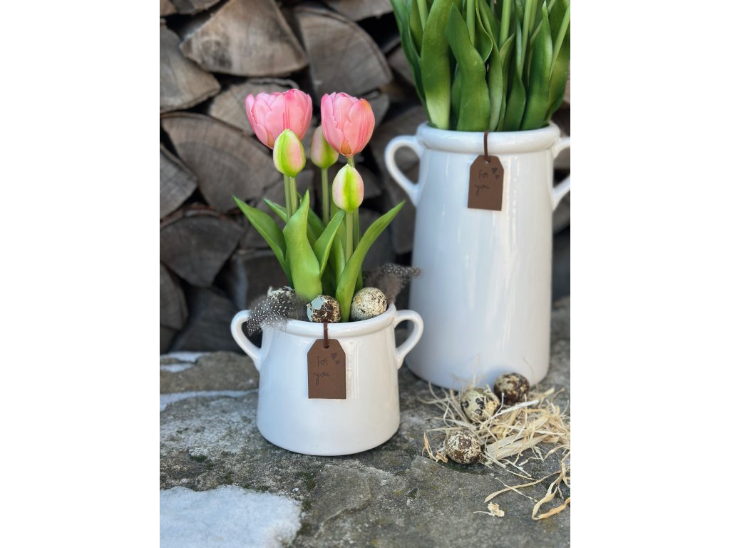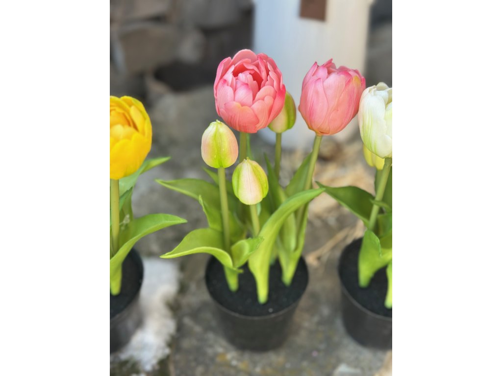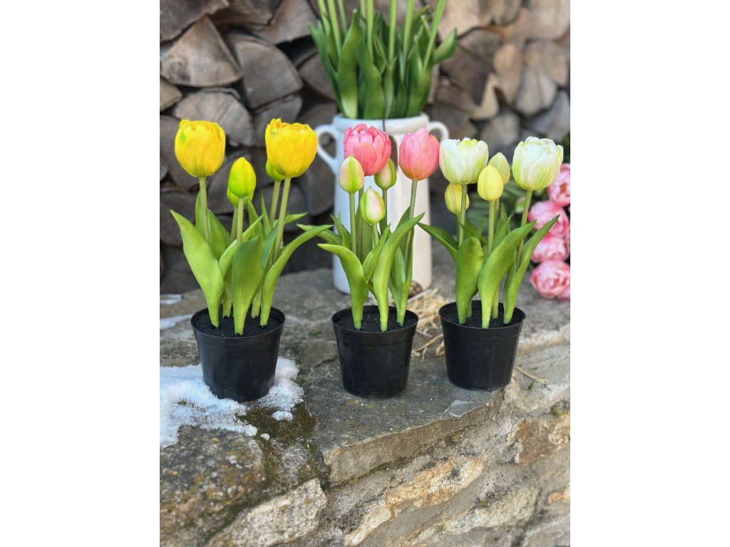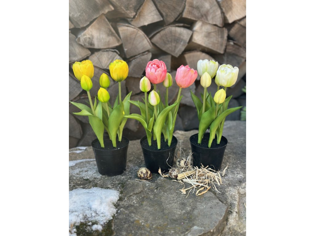 Velmi věrohodné tulipány v květníčku jsou nádhernou a věčnou jarní dekorací. Skládají se ze dvou velkých květů a 3 poupat. Rozměr: výška 22cm, průměr květináče 8,5cm. Skvěle pasují do keramického ušáku.