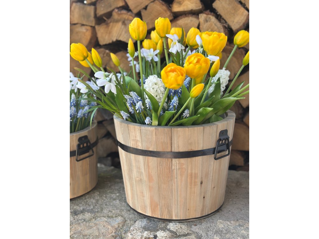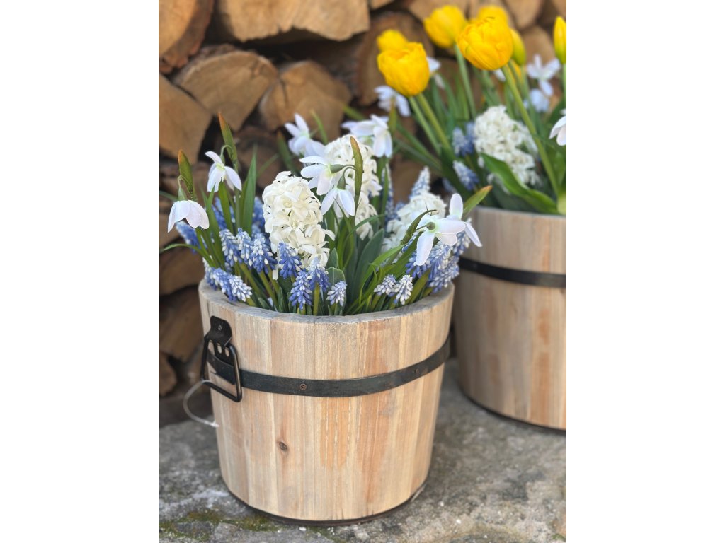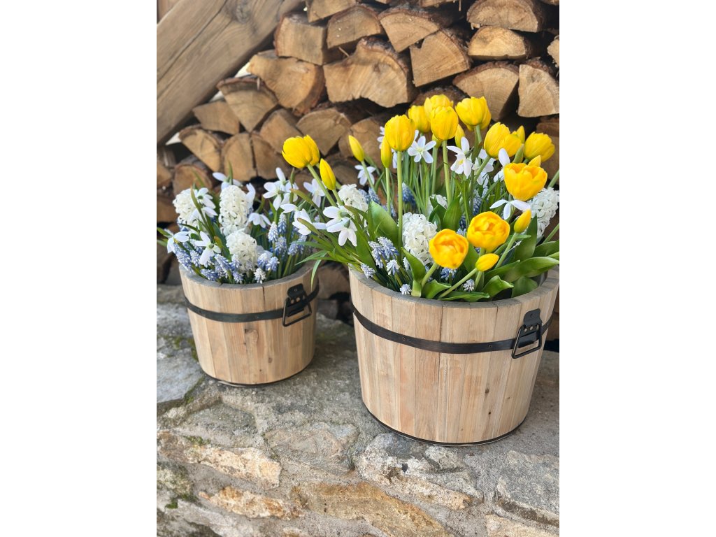 Tato rustikální dřevěná vědra jsou vyrobena ze starého recyklovaného dřeva a dozdobena černým kováním. Uvnitř jsou opatřena igelitem. Můžete je osázet přírodními květinami nebo do nich naaranžovat okouzlující umělé květiny. Hodí se pro celý rok. Krásné v nich bude jaro, léto, podzim i vánoční chvojí. Sada obsahuje 2 vědra (menší a větší). Vetší má rozměr 33 cm x 25 cm a menší 25 cm x 20 cm.