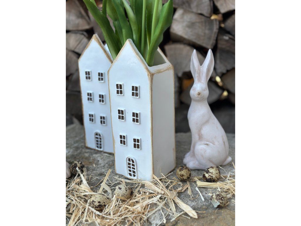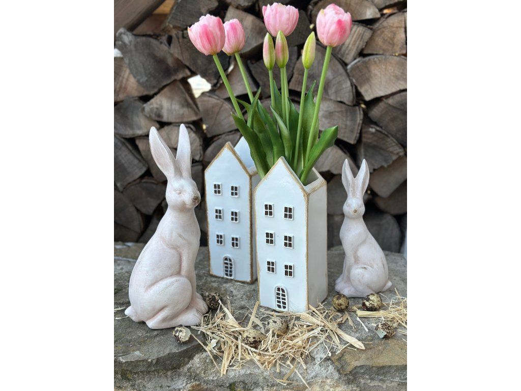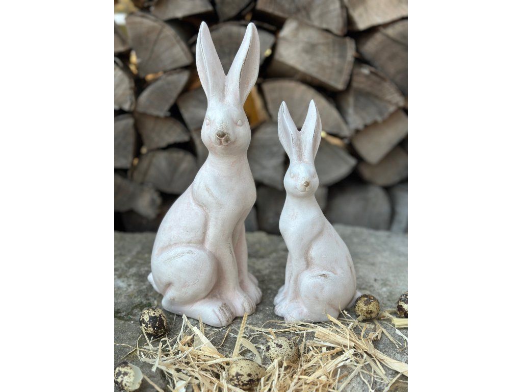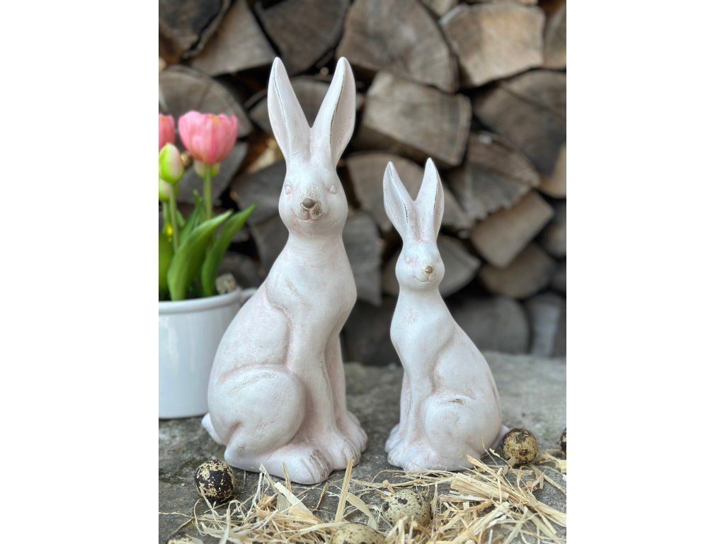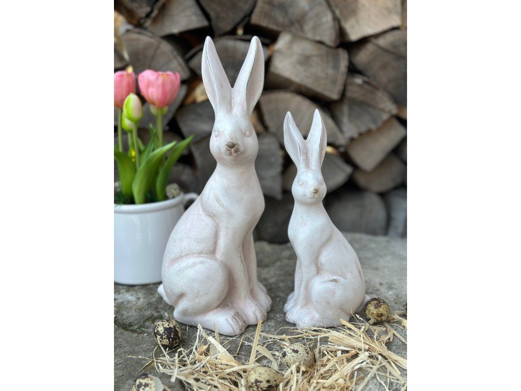 Krásní zajíci ve světlé barvě s velmi pěknou antik patinou dodají šmrnc každé velikonoční výzdobě. Hodí se na komodu, na stůl, do osázených mís. Větší velikost hezky vynikne i na větší skříňce. Výška většího je 30 cm, výška menšího zajíce je 23 cm.