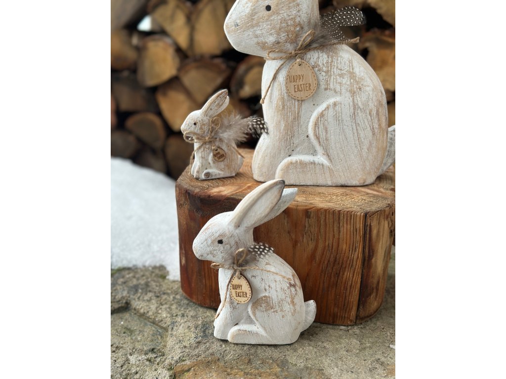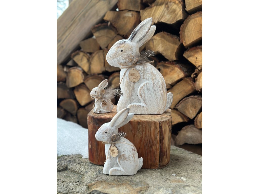 Stylový králící v dekoru dřeva s bílou antik patinou a pěknou dřevěnou cedulkou. V nabídce jsou ve 3 velikostech a nejvíce jim to sluší pohromadě. Ten největší vynikne i venku na parapetu oken.