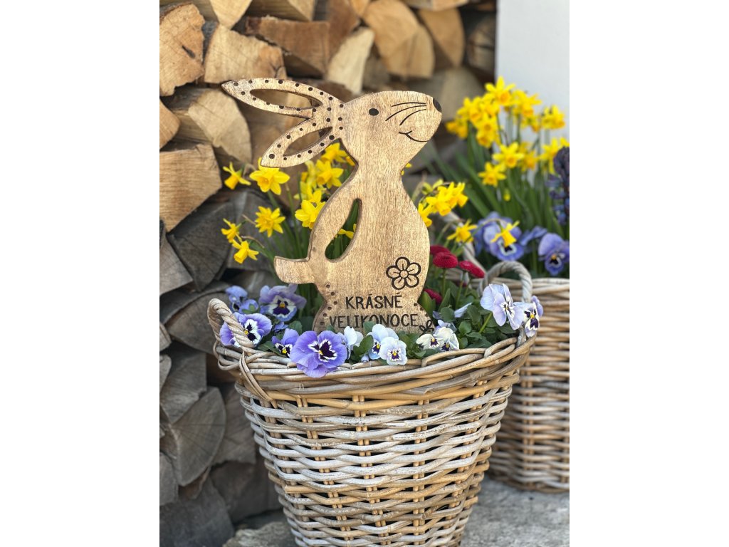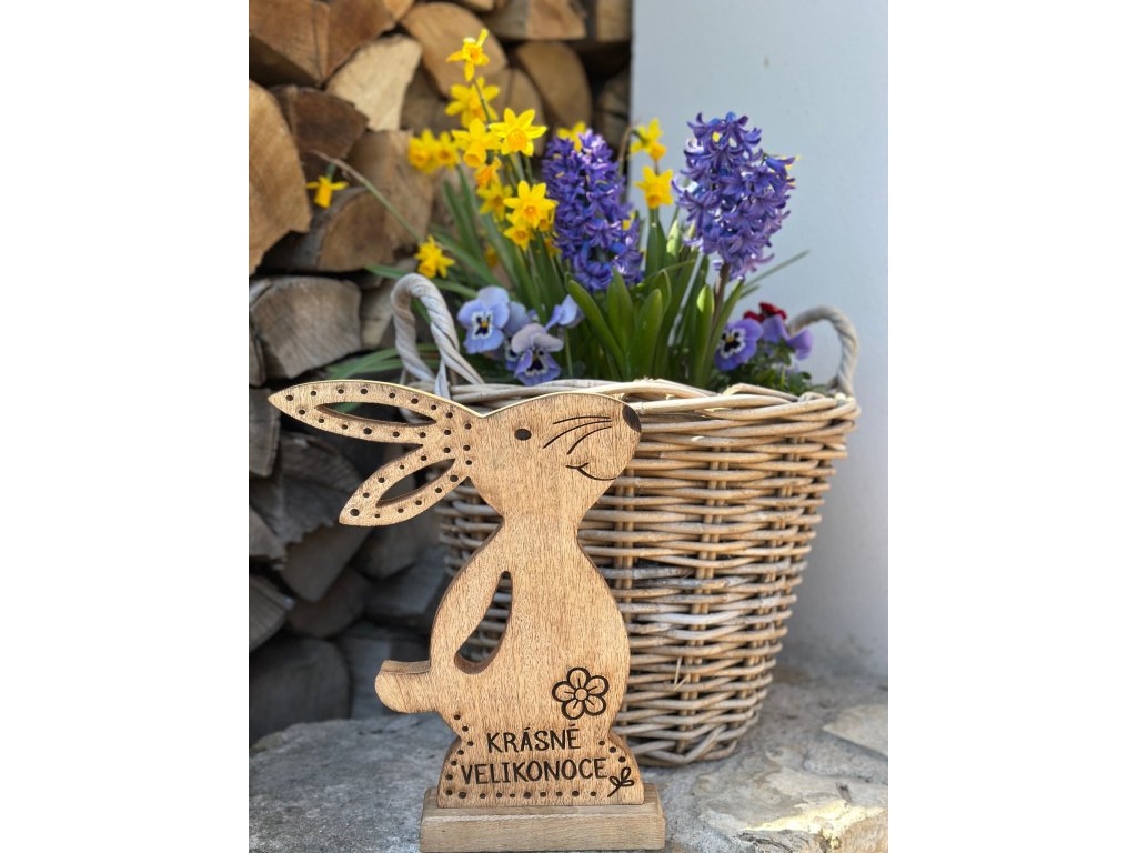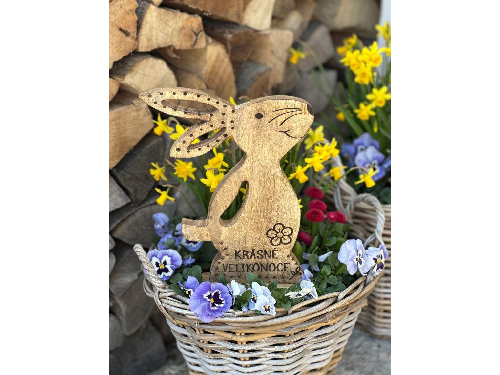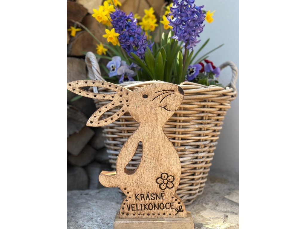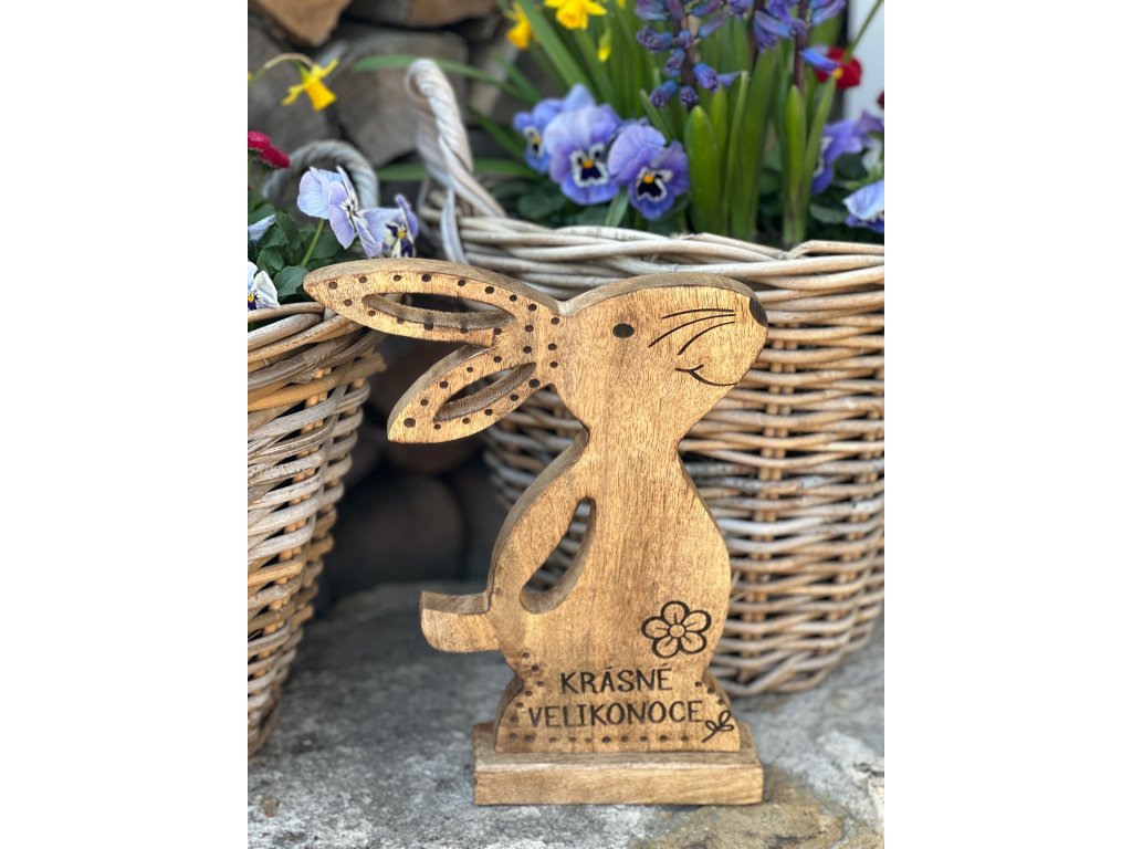 Překrásný zajíc z mangového dřeva s českým nápisem budou tou nejmilejší uvítací dekorací ve Vašem domově. Díky stabilnímu podstavci může stát samostatně u vchodu, na parapetu, můžete ho umístit také do truhlíků či košíků. Velmi pěkně se hodí k lucernám a chaloupkám z mangového dřeva. Zajíc je vysoký 30 cm a široký 24 cm.